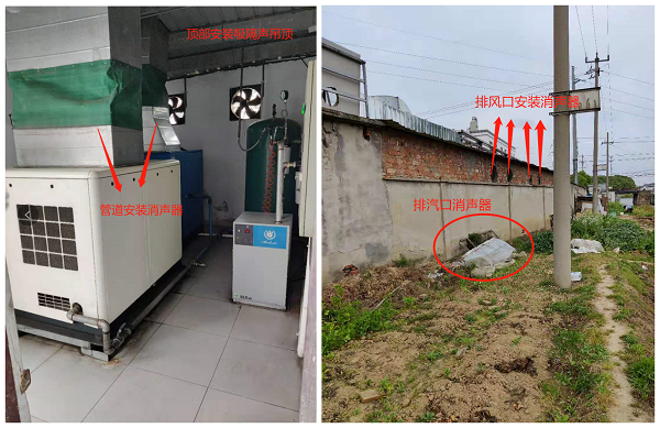 (3)空壓機房隔聲加強??諌簷C噪聲較高且靠近廠界,機房頂部為單層彩鋼板,隔聲量不足,需要進行隔聲加強,空壓機房靠近廠界側有4套排風扇,存在漏聲,空壓機散熱口風管為單層鐵板,均需要加裝消聲器,底部排汽口加裝消聲器。