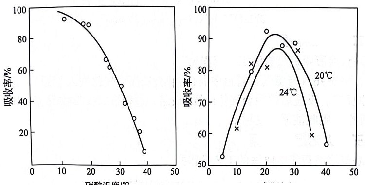 (1)溫度 該法主要是物理吸收過(guò)程,因此降低溫度有利于吸收。溫度與凈化效率的關(guān)系見(jiàn)圖8-7。